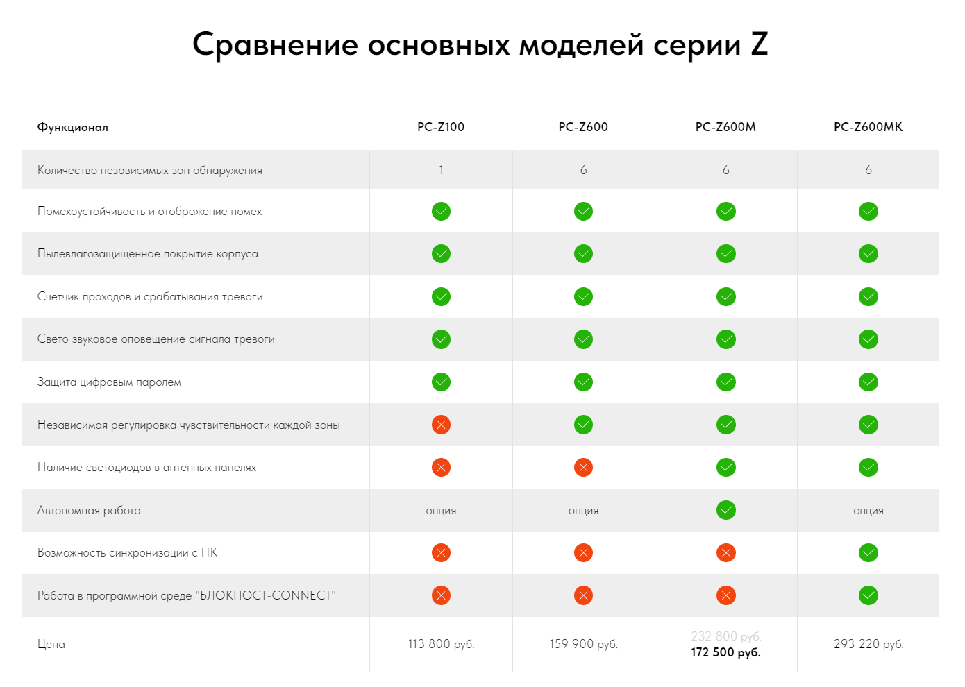 Главный аргумент: за те же деньги (до 165 000 руб.) конкуренты предлагают либо 1-3 зоны (PC Z 3), либо меньшую чувствительность (ZKTeco). PC Z 600 M — единственный 6-зонник с пультом ДУ в этом ценовом сегменте.