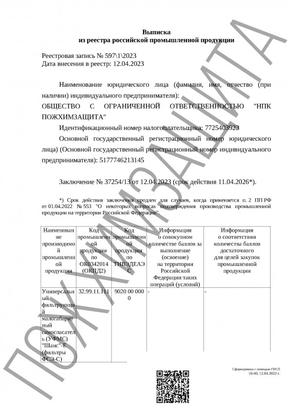 Универсальный фильтрирующий малогабаритный самоспасатель (УФМС) «Шанс» -Е с полумаской (усиленная модель) предназначен (Назначение) для индивидуальной защиты органов дыхания и зрения людей от токсичных продуктов горения (в том числе от монооксида углерода) при эвакуации из задымлённых помещений во время пожара (при пожаре), а также от других опасных химических веществ (паров, газов, аэрозолей) в случаях техногенных аварий и террористических актов.